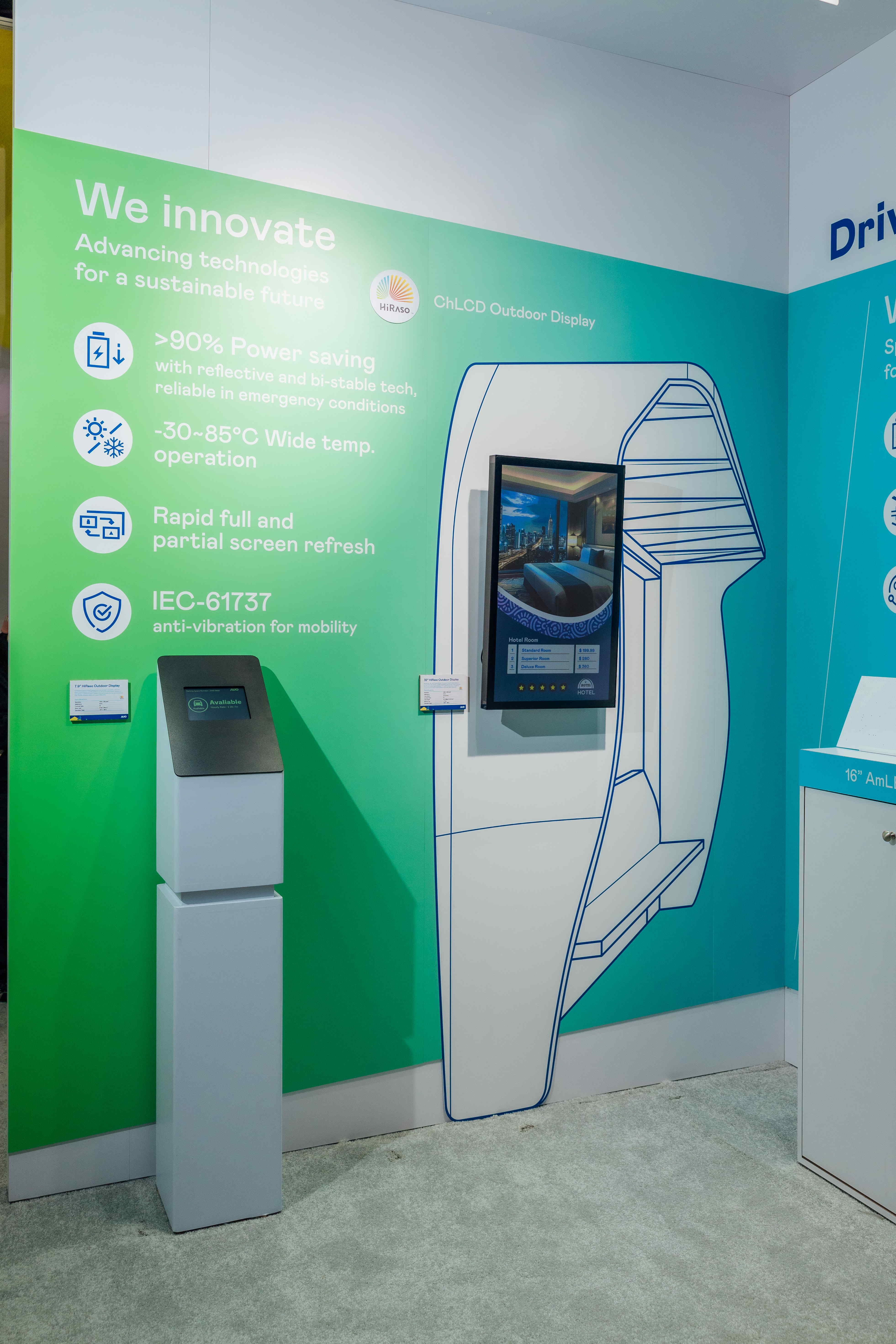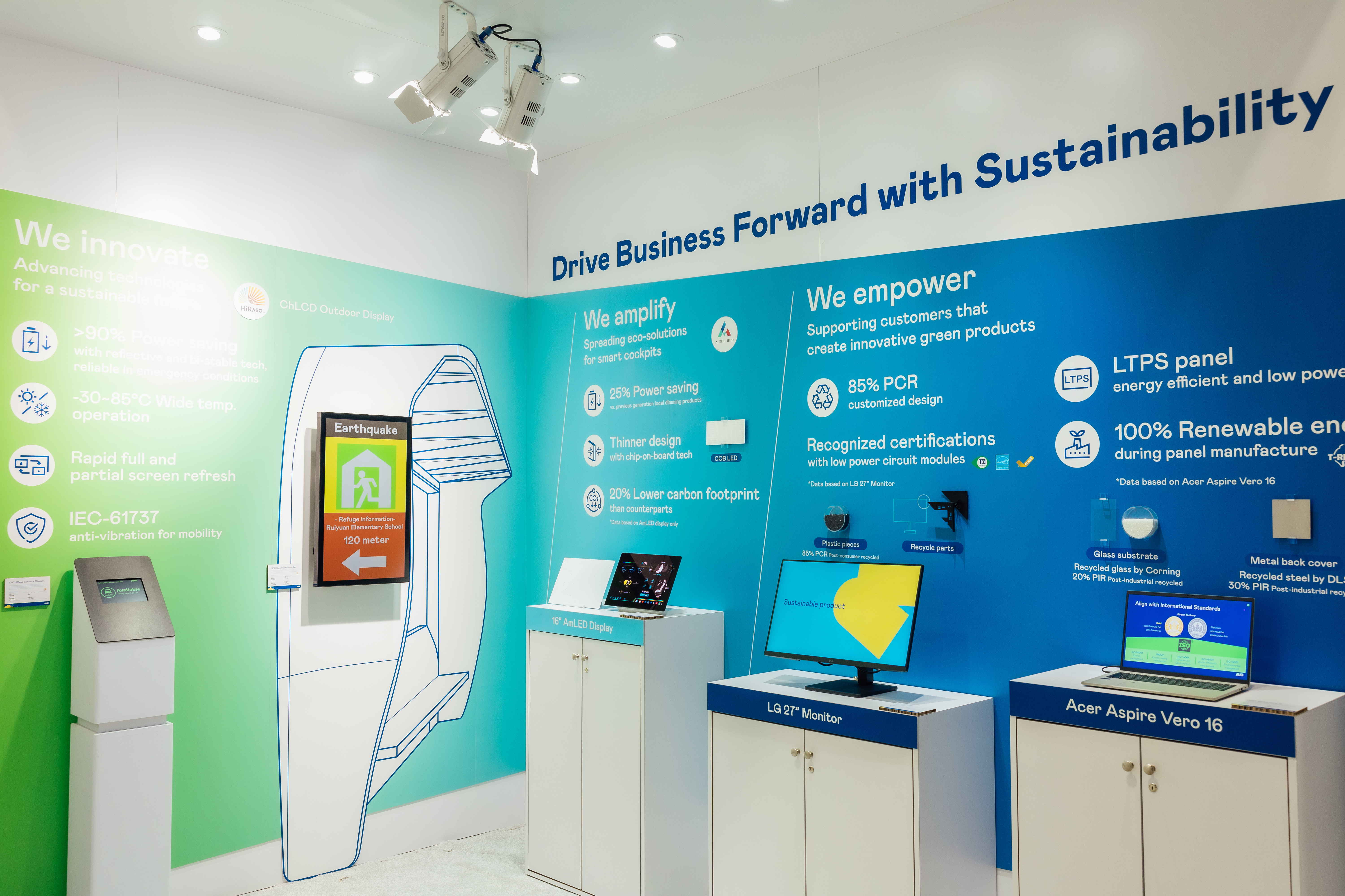 ![]() AUO utilizes innovative display technology HiRaso (Cholesteric Liquid Crystal Display, CHLCD with Bi-stable technology) to achieve zero energy consumption in their displays, expanding power-saving AmLED display technology to automotive products and applying post-consumer recycled (PCR) plastics and panels produced with 100 Perecent Green electricity to notebooks and monitors, thereby increasing green value.